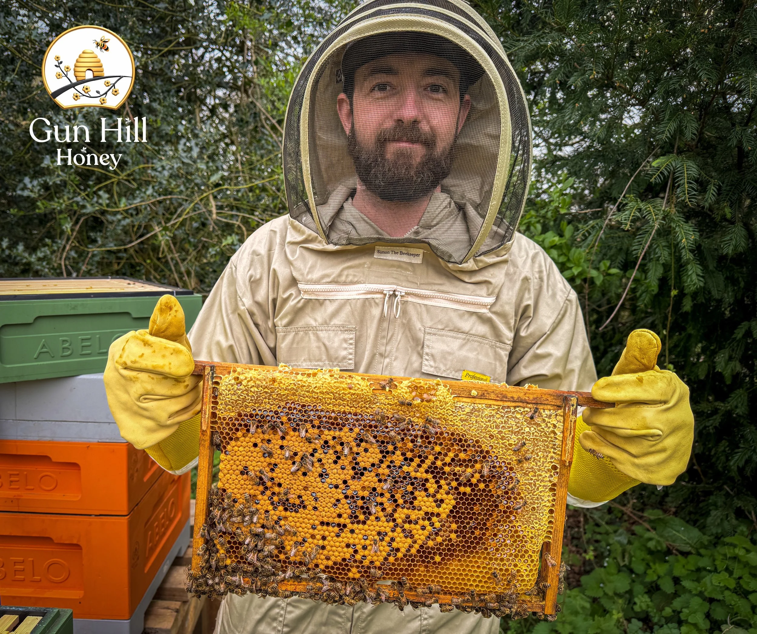 What you can see in the photo is a healthy frame. The biscuit-coloured section in the centre is capped brood—young bees developing and nearly ready to hatch. Surrounding this are larvae waiting to be capped, and around the top of the frame is fresh honey, stored as food for the colony.